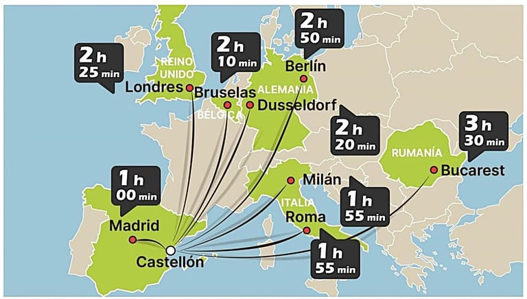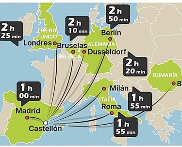 Si no hay vuelos directos a Castellón desde tu país, una buena alternativa es volar al Aeropuerto de Valencia (VLC) (a 1h en coche) o al Aeropuerto de Barcelona (BCN) (a 2.5h en coche), que tienen más conexiones internacionales. Para más informaciones puede consultar la Web https://www.flightconnections.com/es/vuelos-a-castell%C3%B3n-de-la-plana-cdt .