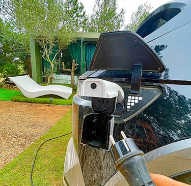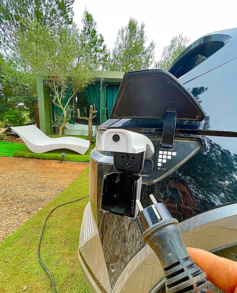Paneles de la casa de Arból en Finca Eden, Coche Ionic 5 cargando la cabaña Cristal y detalle para el cargador del coche. Fuente: personal.